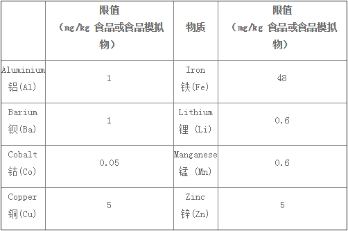 4. 新增附錄II部分鋁的遷移限量,同時修訂鋅的遷移限量。更新后的重金屬特定遷移限量如下表所示: