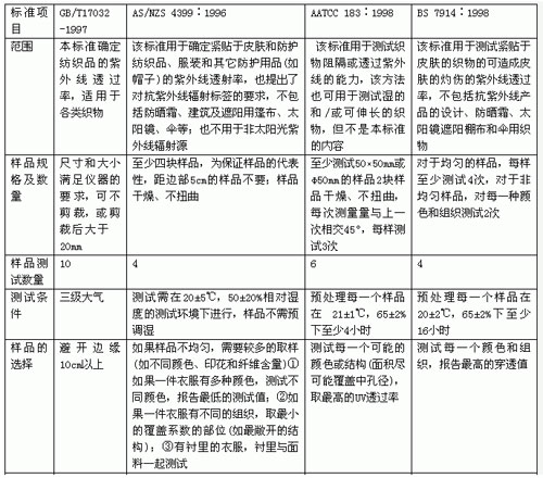 1)測試原理基本相同。紫外線的波長分為UV-A、UV-B和UV-C三個波段,其中UV-A和UV-B對人體的影響最大。GB/T 17032為UV-B波段(主峰波長297nm)的透過率;AS/NZS4399、AATCC183、BS7914為UV-A和UV-B兩個波段的UFF值或透過率。