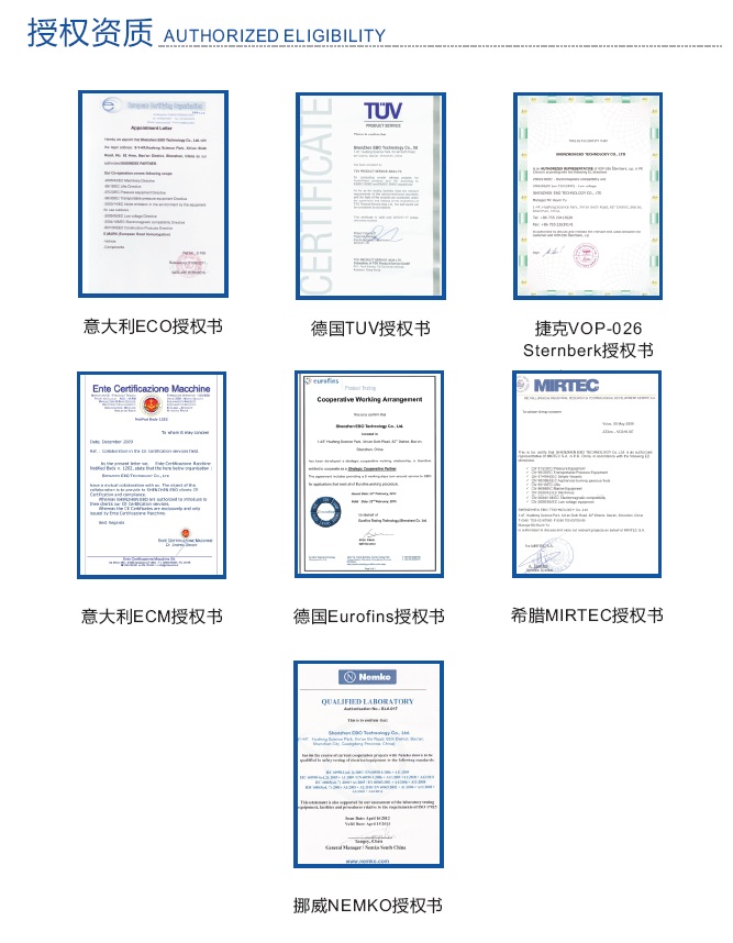 EBO已獲得眾多國際認證機構的認可,是德國TUV、EMCC, 美國UL、FCC、TIMCO,加拿大IC、捷克EZU,意大利ECO、ECM,挪威NEMKO等國際權威機構授權合作的實驗室,檢測報告具有國際公信力。EBO可直接進行歐盟CE認證、美國FCC認證、CCC、C-Tick、SAA、MEPS、ETL、UL、E-MARK、FDA、RoHS、REACH、VCCI、PSE等認證的全部測試,協(xié)助客戶一次申請獲得多國的認證證書。產品范圍包括信息技術類、家電類、燈具類、電動工具類、廣播電視音響類、工業(yè)、科學、醫(yī)療類,汽車電子、無線射頻產品、機械設備、建材、家具、體育運動器械等。