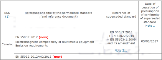 歐盟新的EMC標(biāo)準(zhǔn)EN55032將于2017年3月5日強(qiáng)制實(shí)施,正式取代EN 55013 (音視頻設(shè)備(AV) EMC標(biāo)準(zhǔn))和EN55022(傳統(tǒng)信息技術(shù)設(shè)備(ITE) EMC標(biāo)準(zhǔn)).