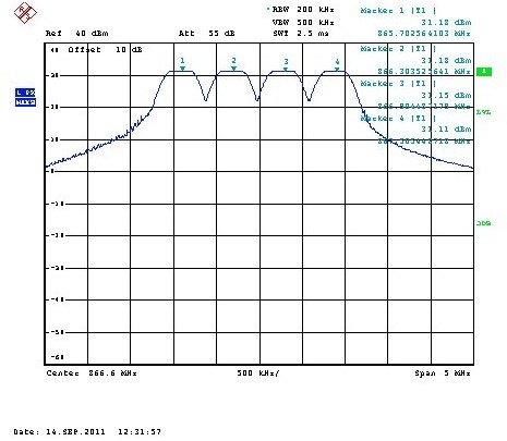 下面針對一款掃描機(jī)的測試進(jìn)行介紹,該產(chǎn)品調(diào)制方式為ASK,功率為30±3dBm,有效工作頻點(diǎn)為:865.7MHz,866.3MHz,866.9MHz,867.5MHz。