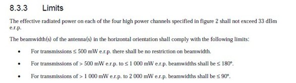 3:1000mW至2000mW erp的,其發(fā)射機(jī)射束帶寬不超過90°。