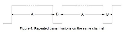 定義為發(fā)射機(jī)持續(xù)發(fā)射的周期時間,目的是驗(yàn)證是否其在有效的進(jìn)行發(fā)射。通過驗(yàn)證產(chǎn)品的持續(xù)發(fā)射時間與停止發(fā)射的時間,來判斷其是否符合標(biāo)準(zhǔn)中的要求。持續(xù)發(fā)射時間A不能大于4S,發(fā)射間隙B不能小于100ms.