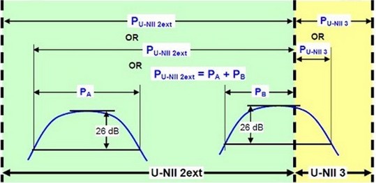 5. 針對(duì)兩個(gè)相鄰信號(hào)功率的測(cè)量有三種方式,如下圖所示。第一種是測(cè)量整個(gè)UNII的頻帶,第二種是從兩個(gè)非相鄰信號(hào)的最低和最高頻點(diǎn)做測(cè)量,第三種是分別測(cè)量這兩個(gè)非相鄰信號(hào)之后再相加;如果有一信號(hào)橫跨了兩個(gè)UNII的頻段,就必須將此信號(hào)分開測(cè)量,以被橫跨的那個(gè)頻點(diǎn)為邊界。