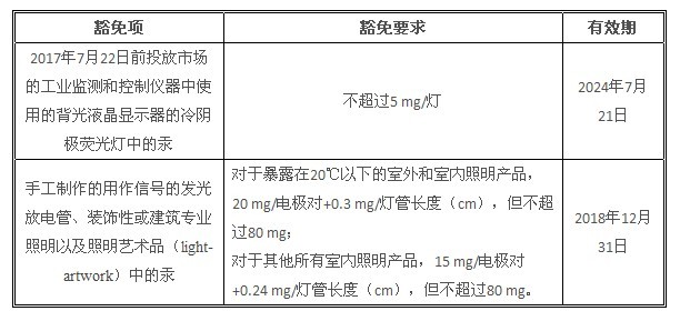 2014年5月20日,歐盟在其官方公報上正式發(fā)布了RoHS指令的八項豁免,其中與照明設(shè)備相關(guān)的豁免有兩項: